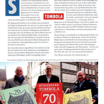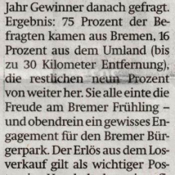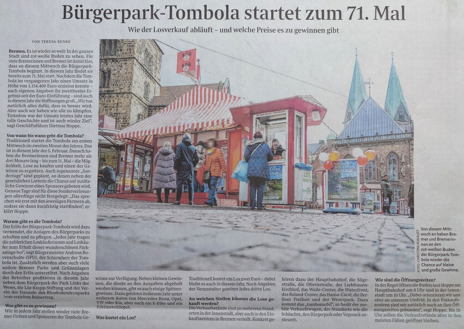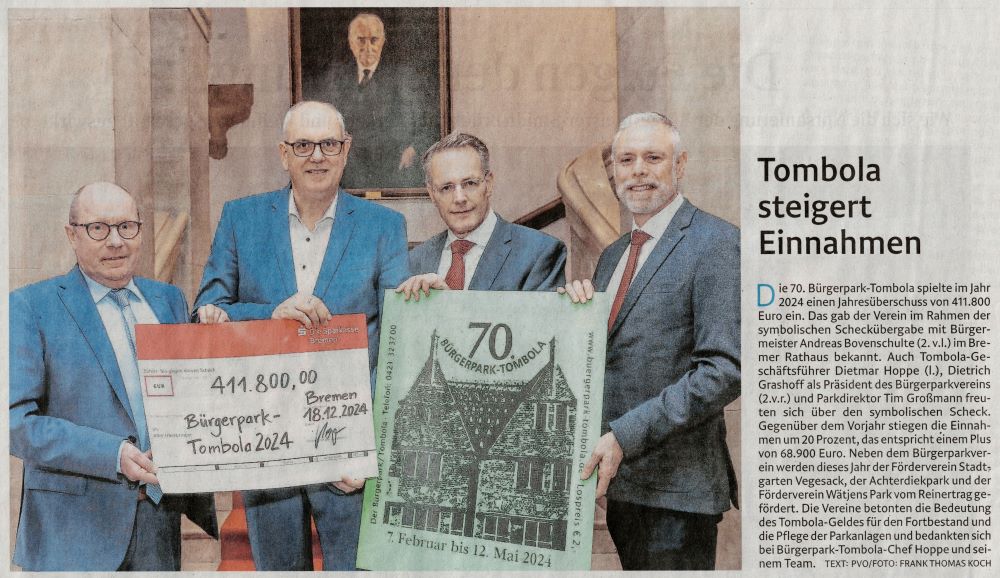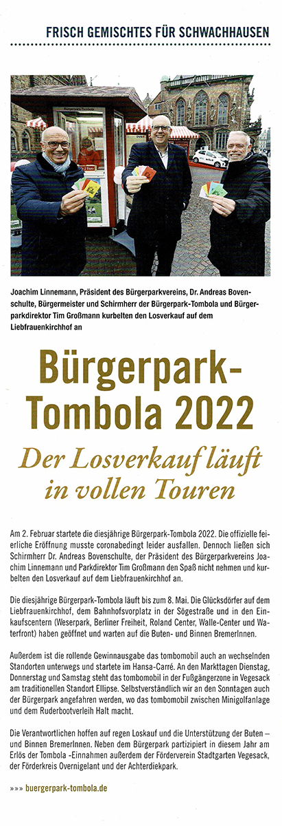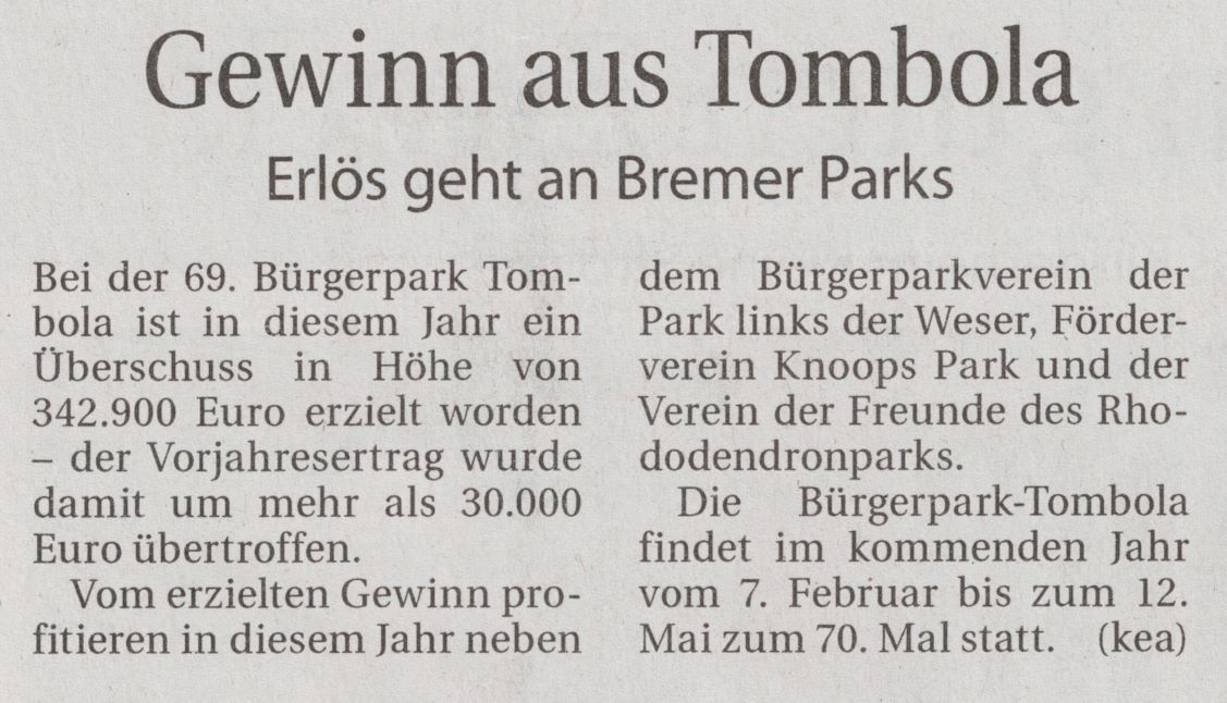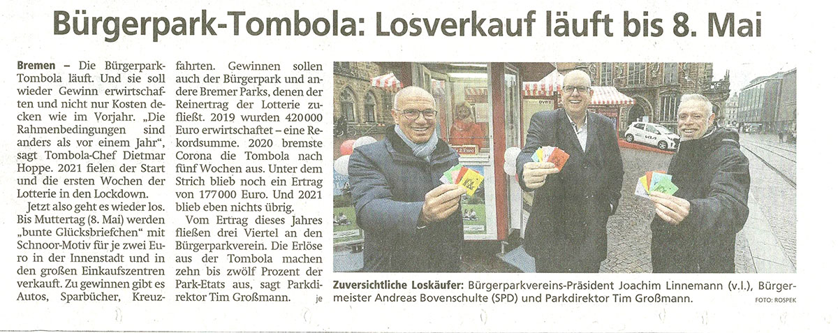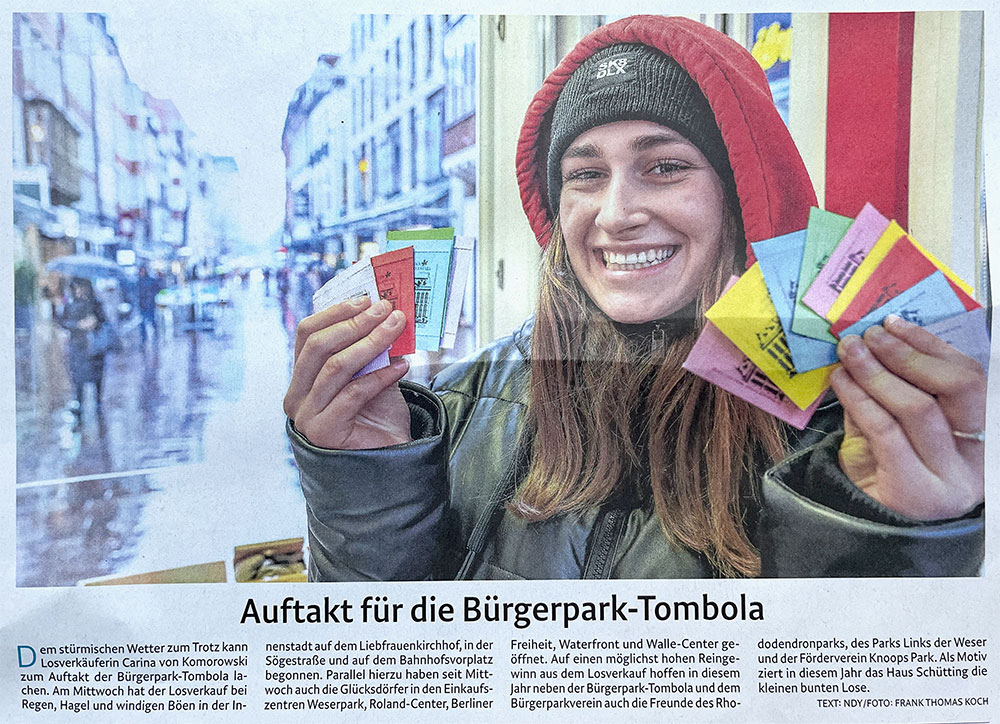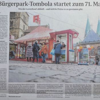 Sie möchten gerne für die Bürgerpark-Tombola zugunsten des Bremer Bürgerparks und vielen anderen Bremer Parks und Projekten hochwertige Gewinne spenden? Rufen Sie uns an, wir freuen uns darauf Ihnen die Vorteile einer Spende für diese gute Sache zu erläutern: 0421 323666.