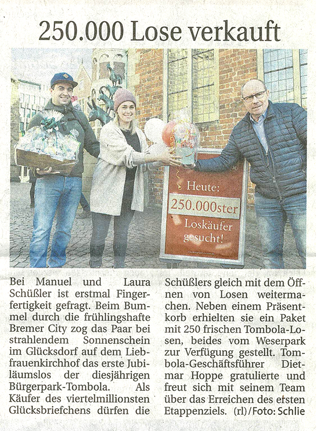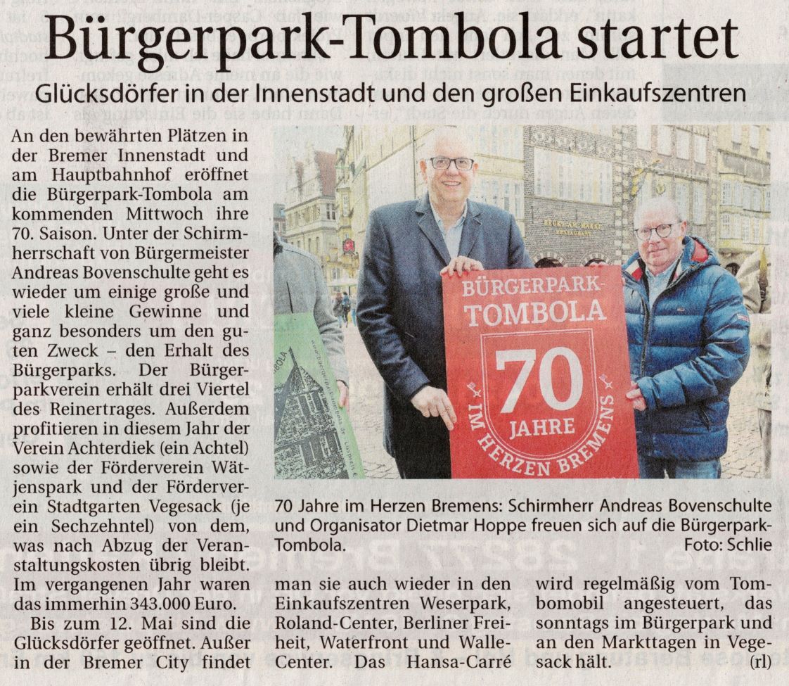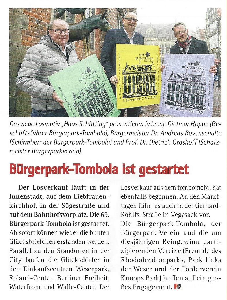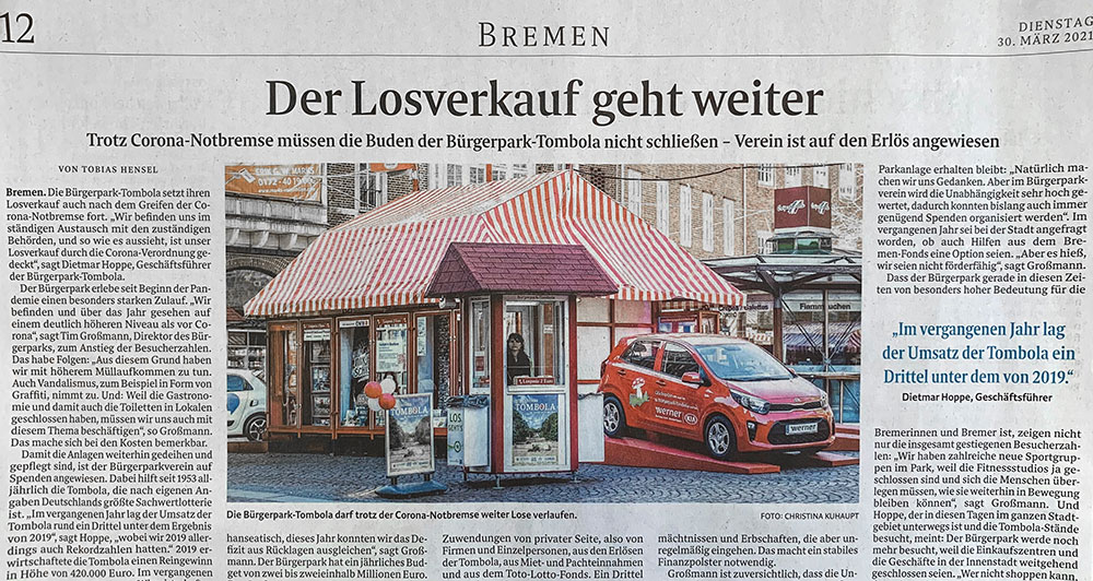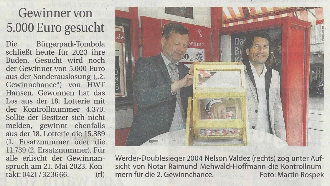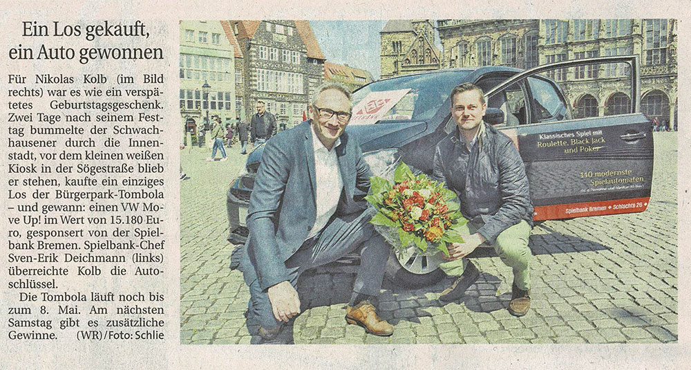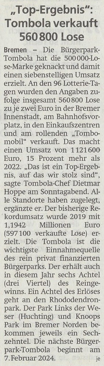 Sie möchten gerne für die Bürgerpark-Tombola zugunsten des Bremer Bürgerparks und vielen anderen Bremer Parks und Projekten hochwertige Gewinne spenden? Rufen Sie uns an, wir freuen uns darauf Ihnen die Vorteile einer Spende für diese gute Sache zu erläutern: 0421 323666.