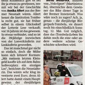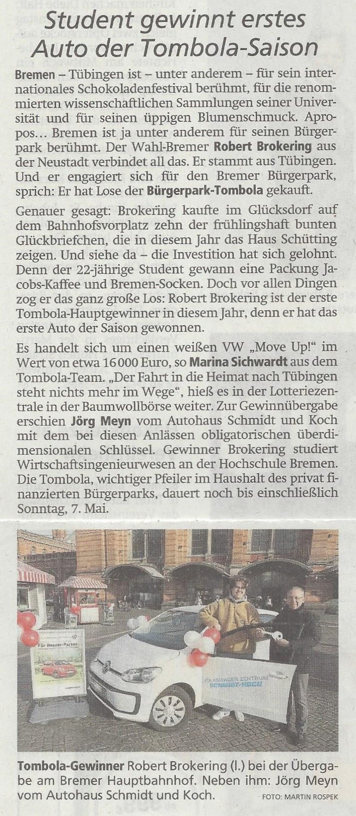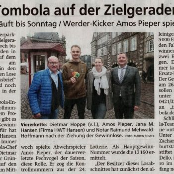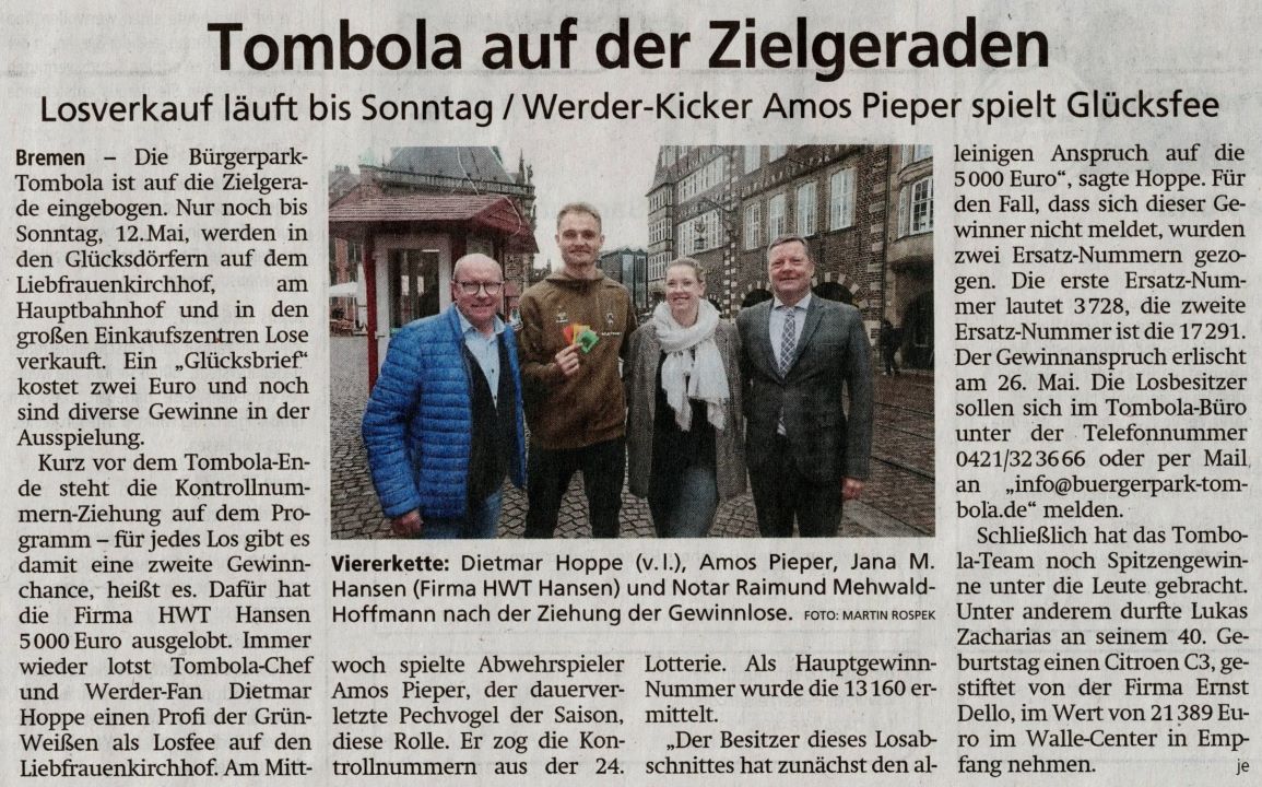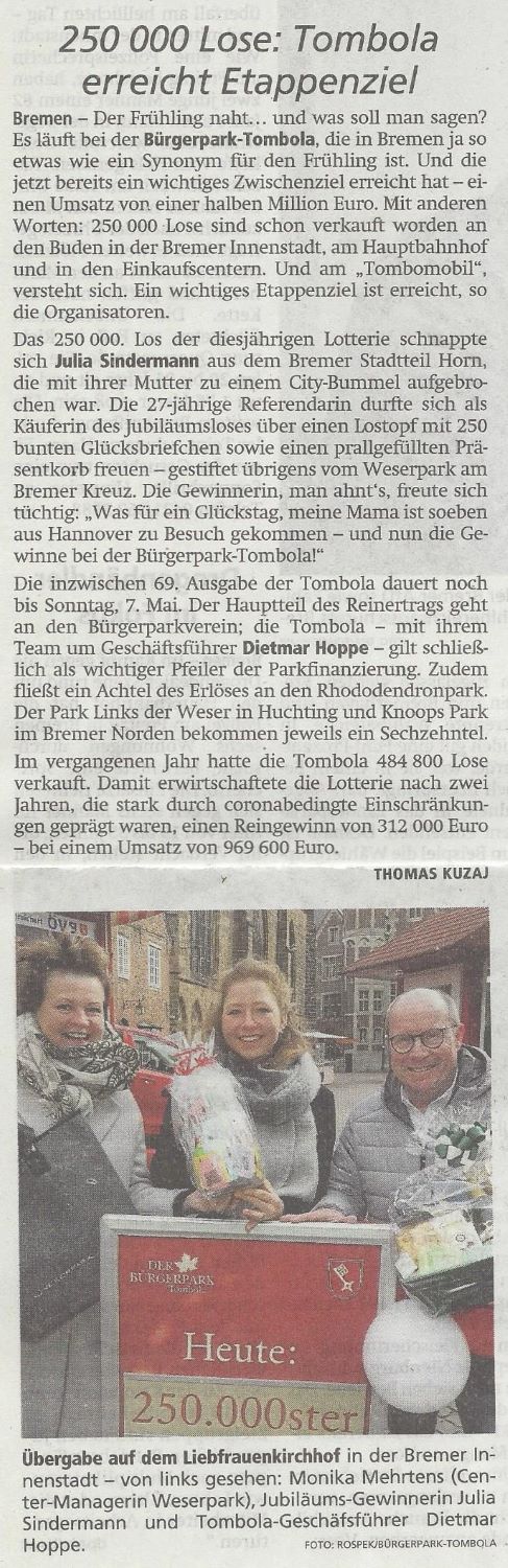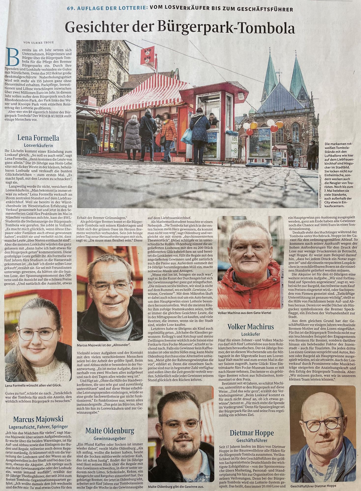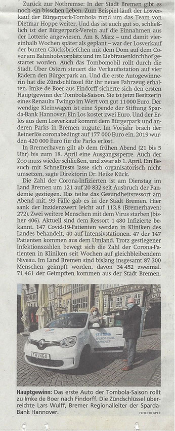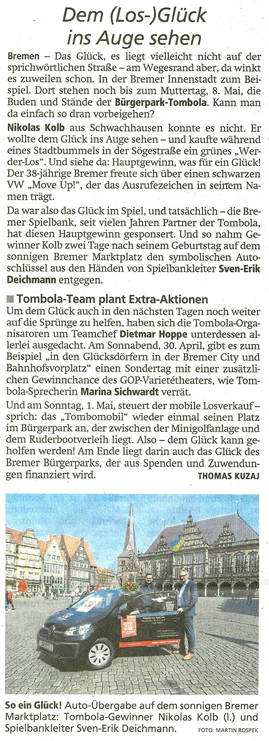 Sie möchten gerne für die Bürgerpark-Tombola zugunsten des Bremer Bürgerparks und vielen anderen Bremer Parks und Projekten hochwertige Gewinne spenden? Rufen Sie uns an, wir freuen uns darauf Ihnen die Vorteile einer Spende für diese gute Sache zu erläutern: 0421 323666.