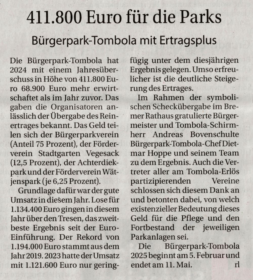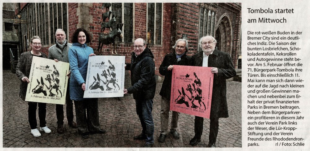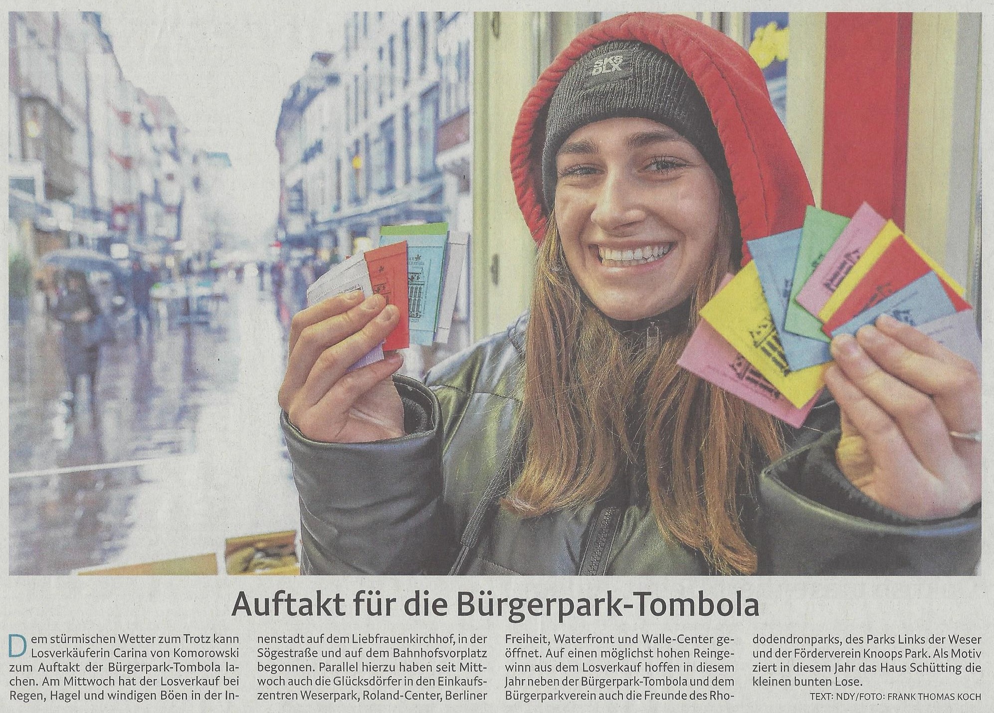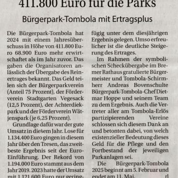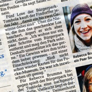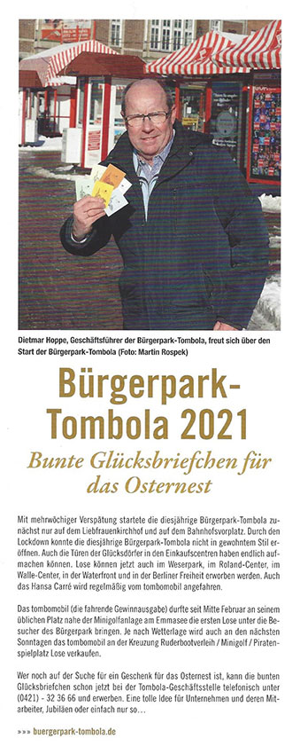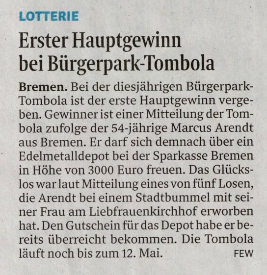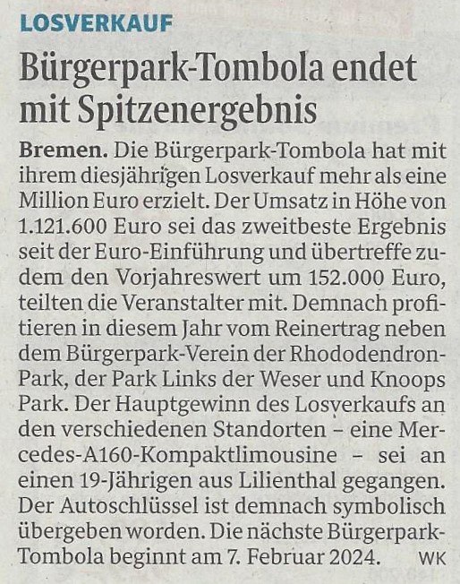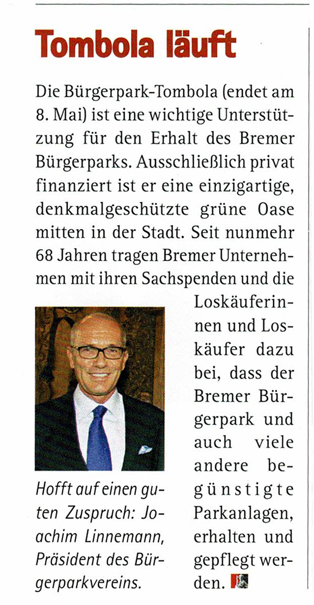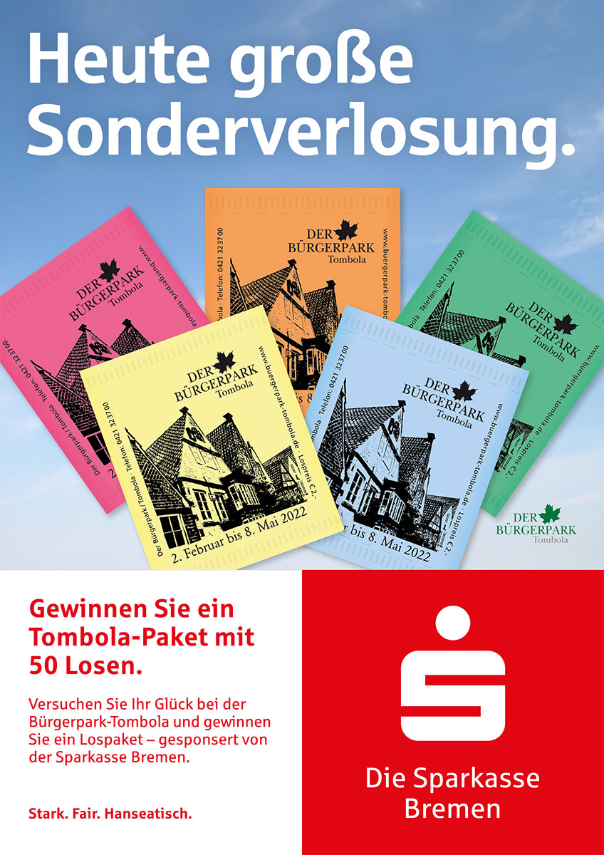 Sie möchten gerne für die Bürgerpark-Tombola zugunsten des Bremer Bürgerparks und vielen anderen Bremer Parks und Projekten hochwertige Gewinne spenden? Rufen Sie uns an, wir freuen uns darauf Ihnen die Vorteile einer Spende für diese gute Sache zu erläutern: 0421 323666.