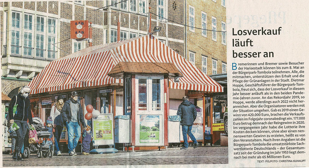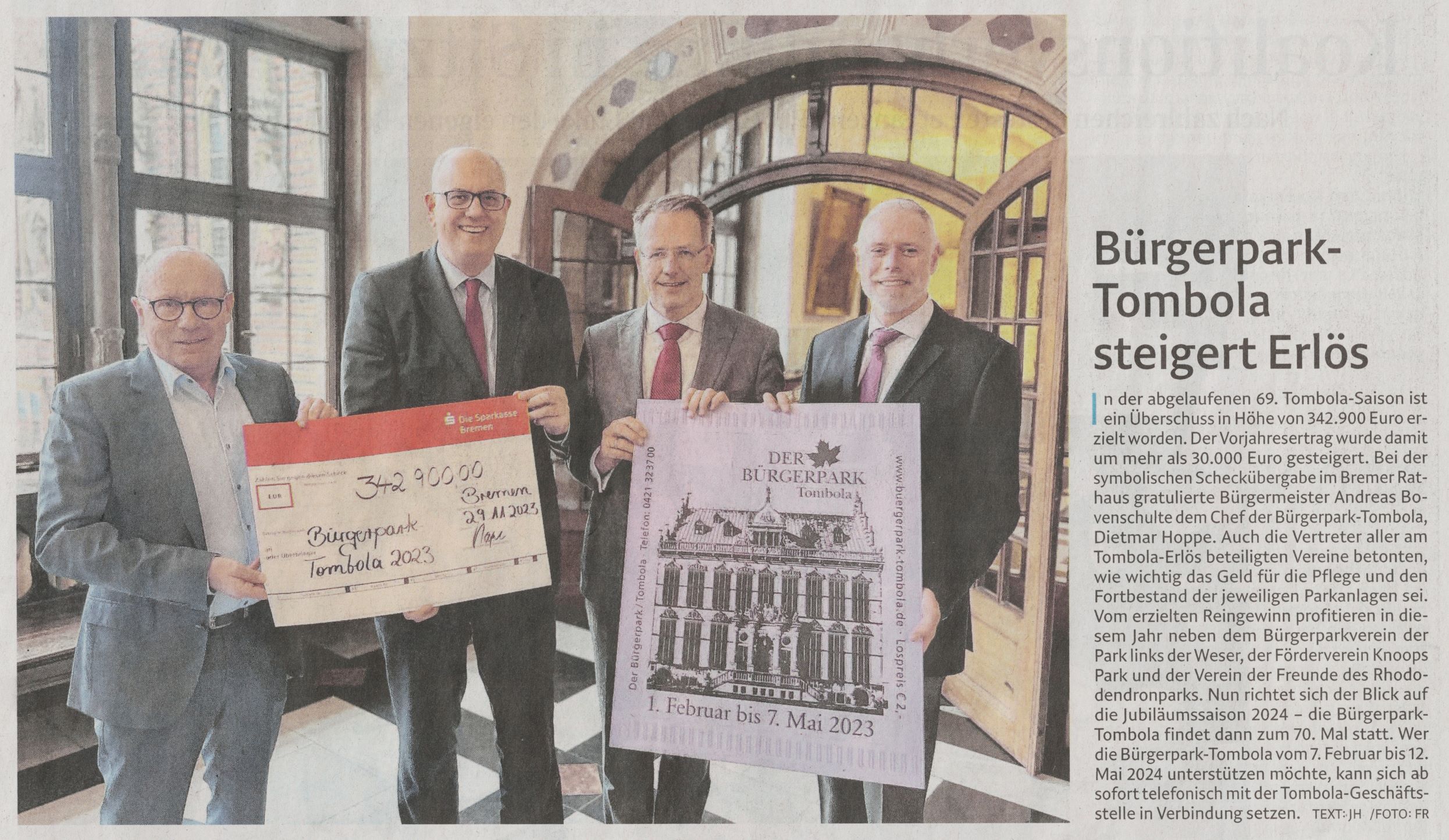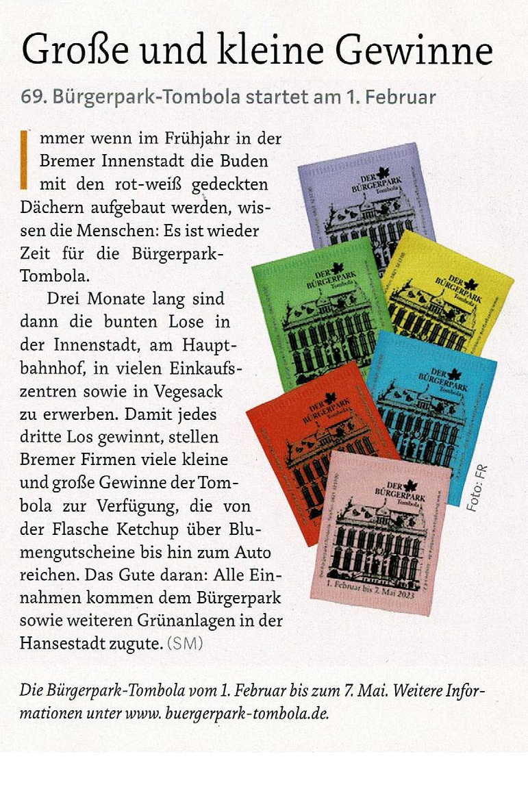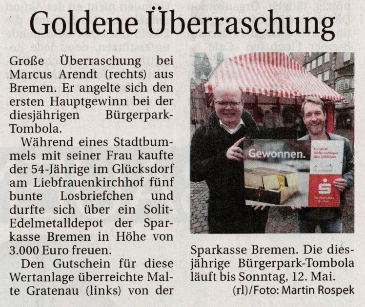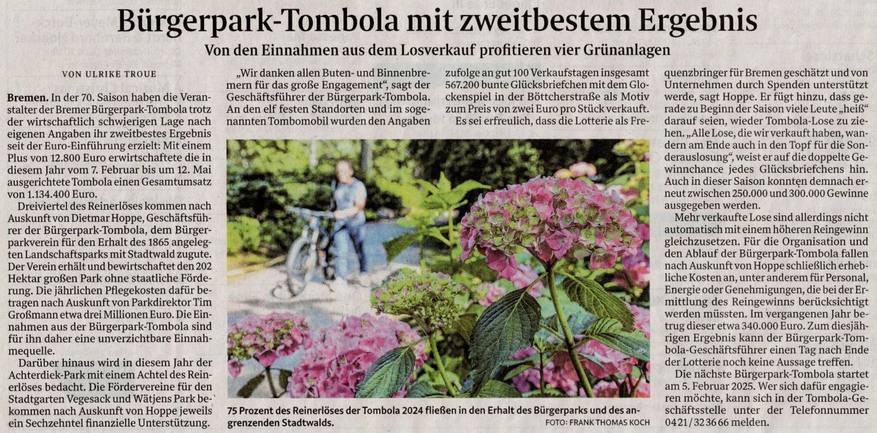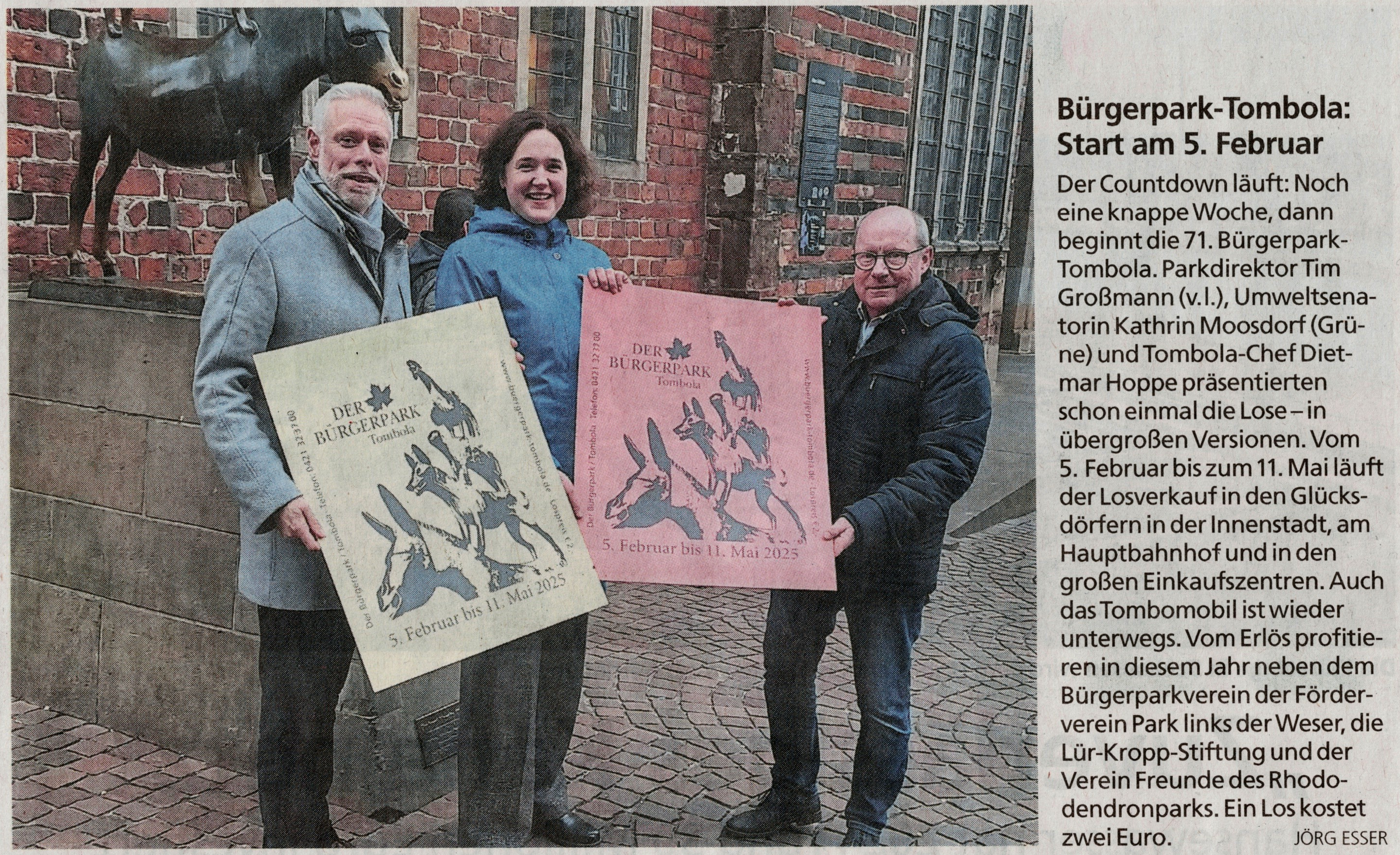 Sie möchten gerne für die Bürgerpark-Tombola zugunsten des Bremer Bürgerparks und vielen anderen Bremer Parks und Projekten hochwertige Gewinne spenden? Rufen Sie uns an, wir freuen uns darauf Ihnen die Vorteile einer Spende für diese gute Sache zu erläutern: 0421 323666.