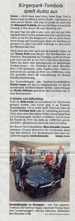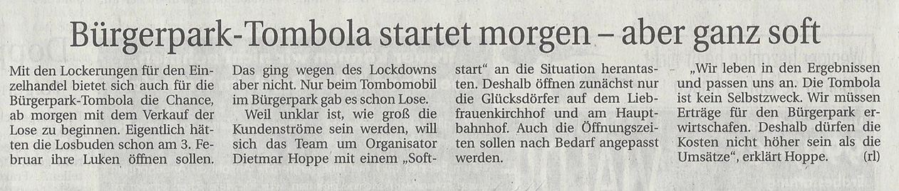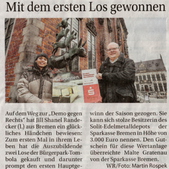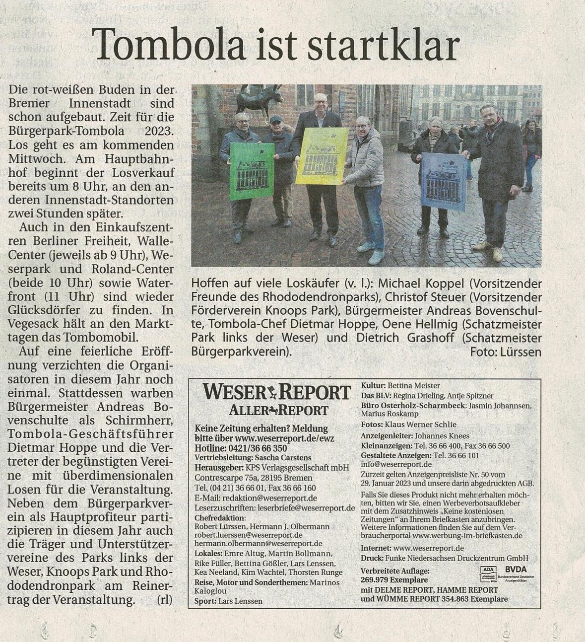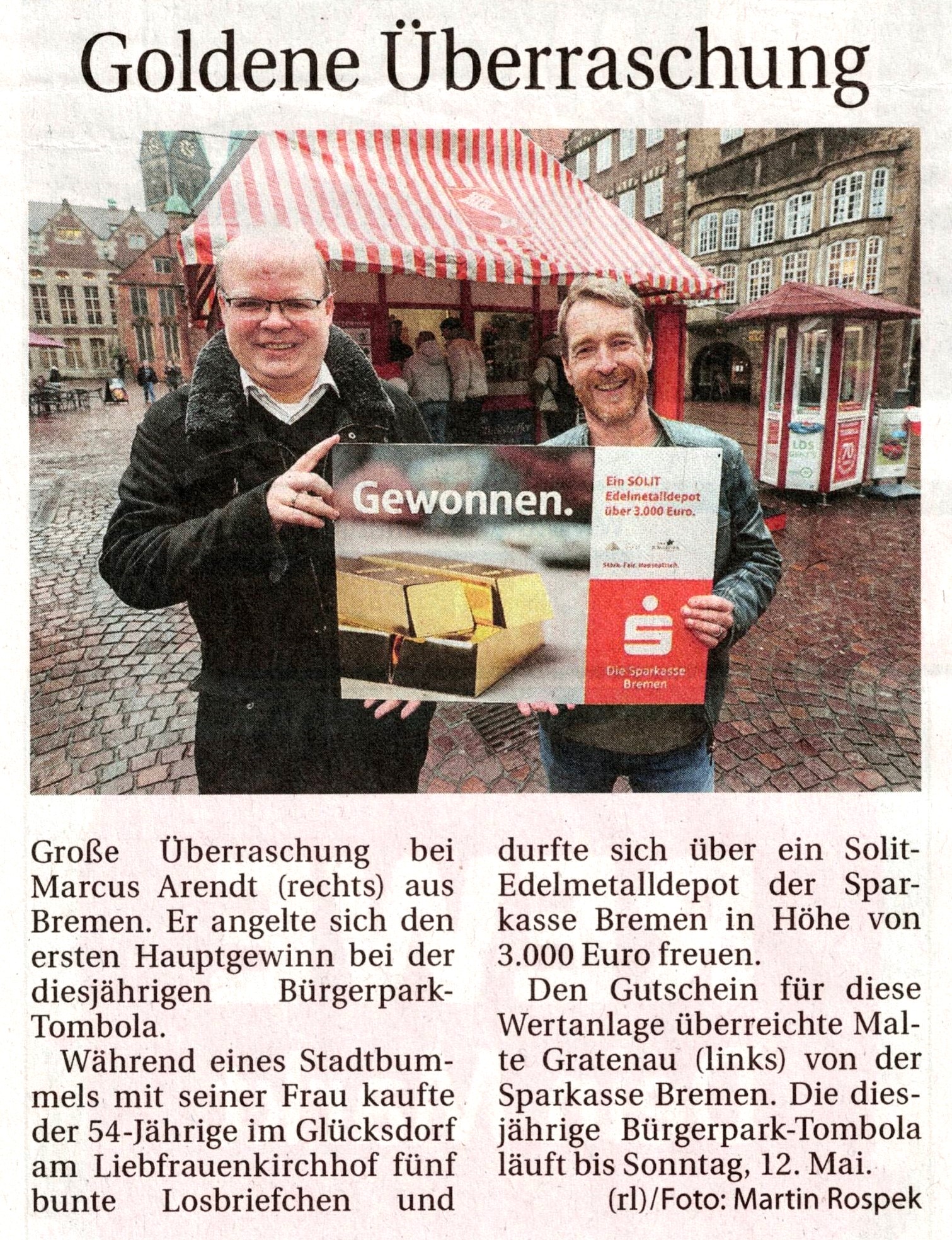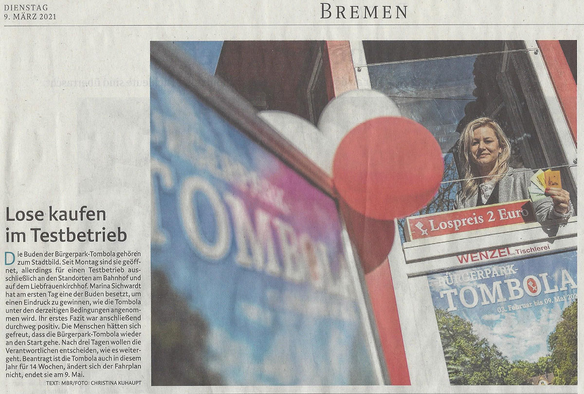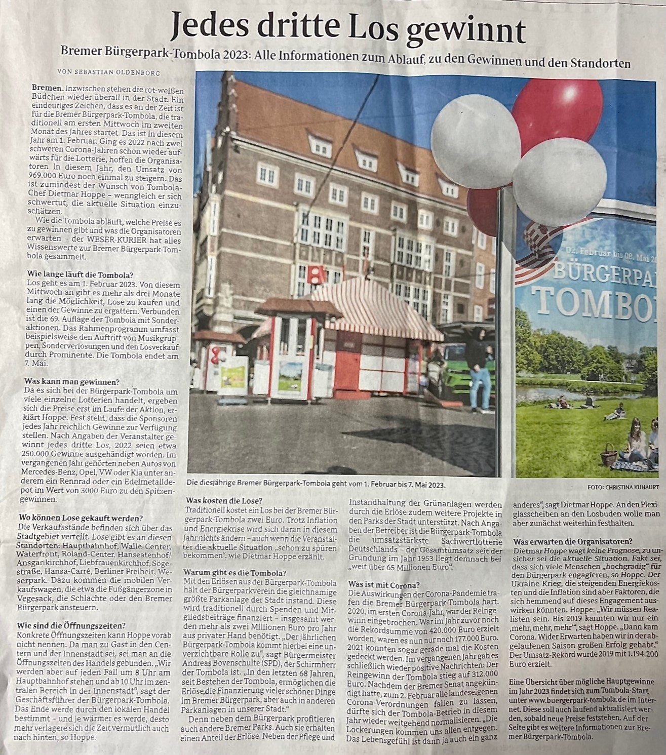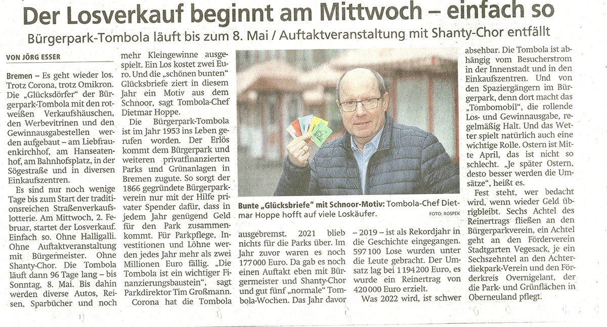 Sie möchten gerne für die Bürgerpark-Tombola zugunsten des Bremer Bürgerparks und vielen anderen Bremer Parks und Projekten hochwertige Gewinne spenden? Rufen Sie uns an, wir freuen uns darauf Ihnen die Vorteile einer Spende für diese gute Sache zu erläutern: 0421 323666.