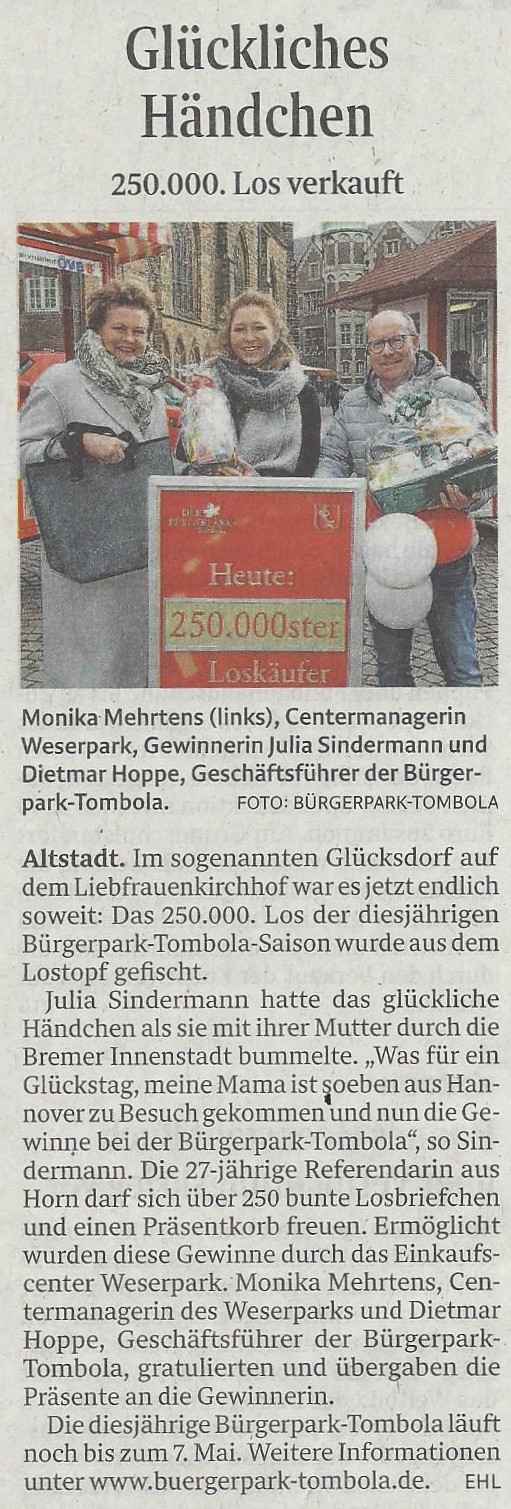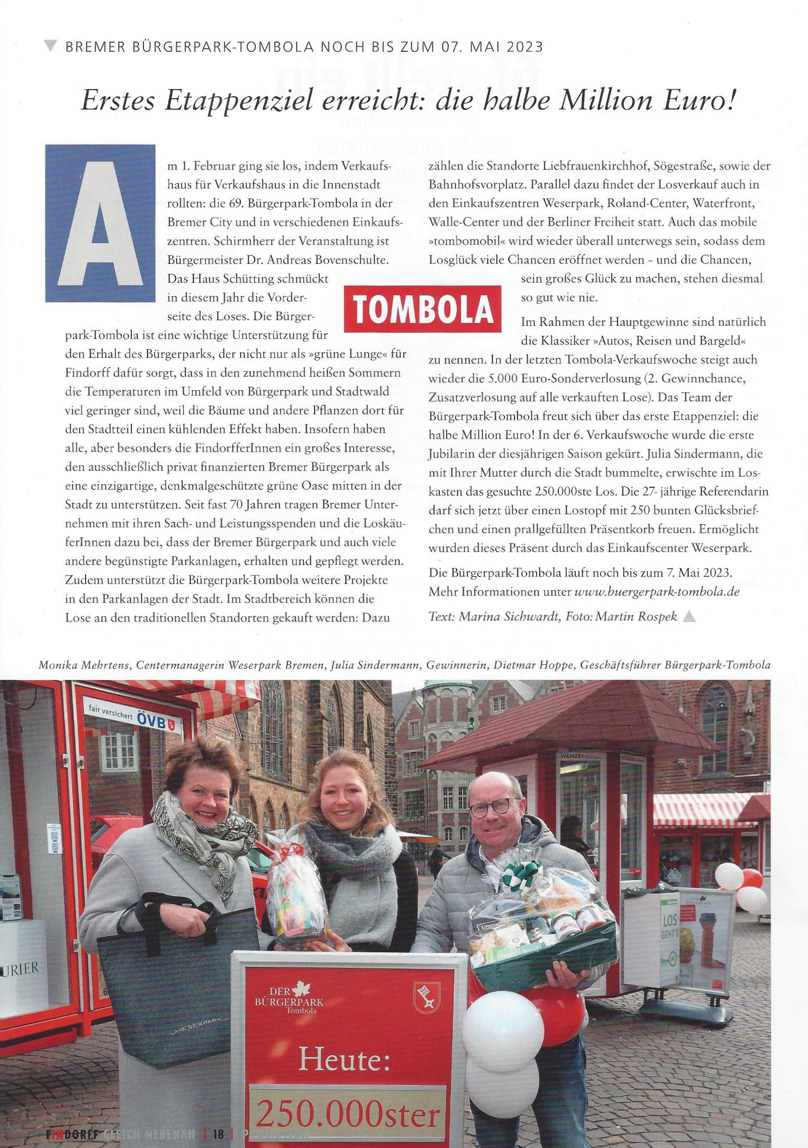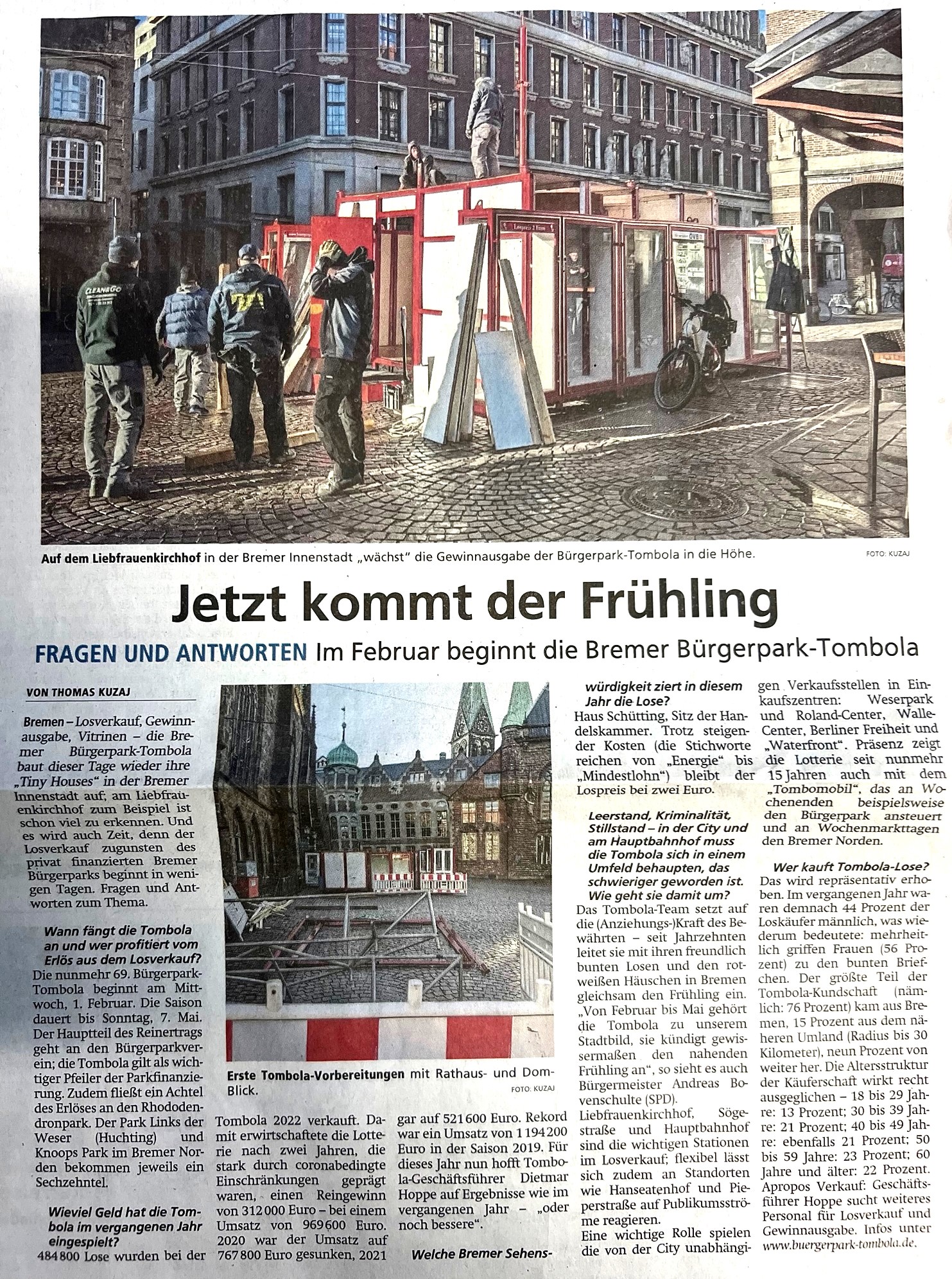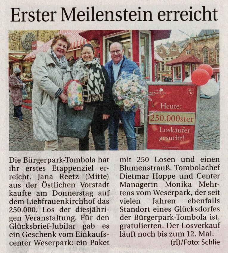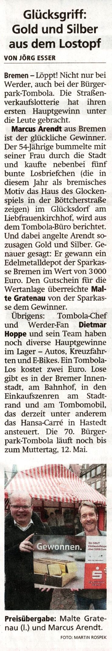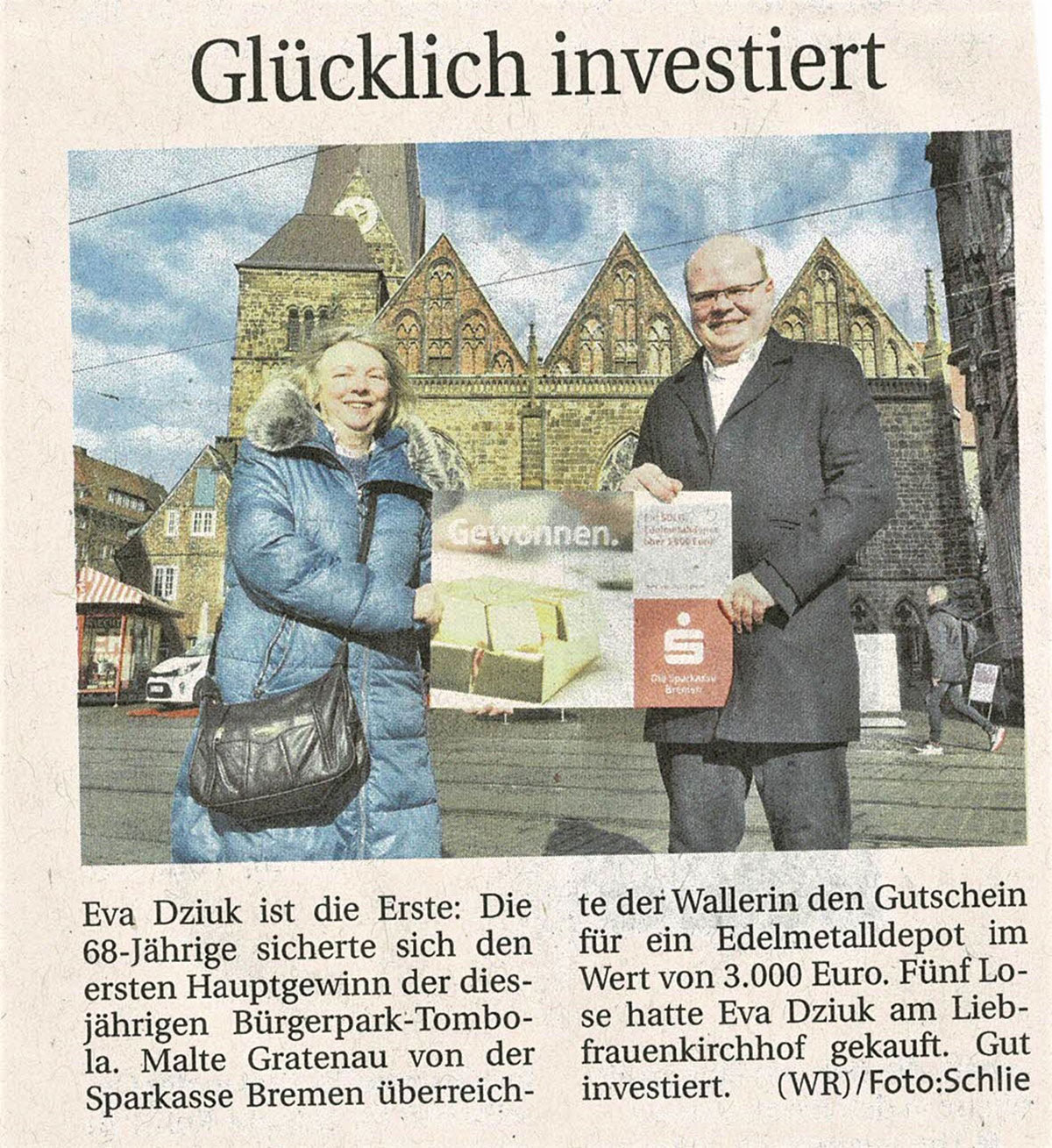 Sie möchten gerne für die Bürgerpark-Tombola zugunsten des Bremer Bürgerparks und vielen anderen Bremer Parks und Projekten hochwertige Gewinne spenden? Rufen Sie uns an, wir freuen uns darauf Ihnen die Vorteile einer Spende für diese gute Sache zu erläutern: 0421 323666.