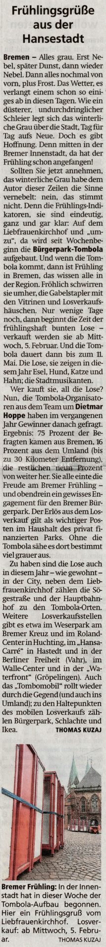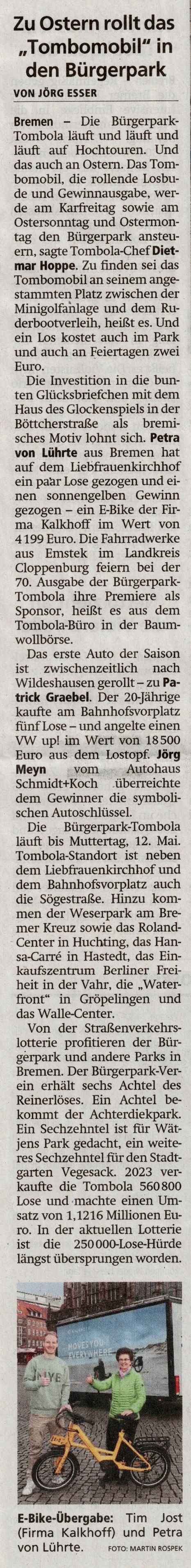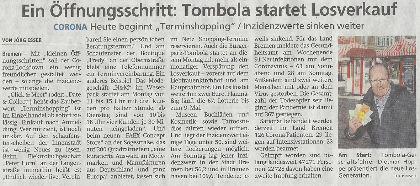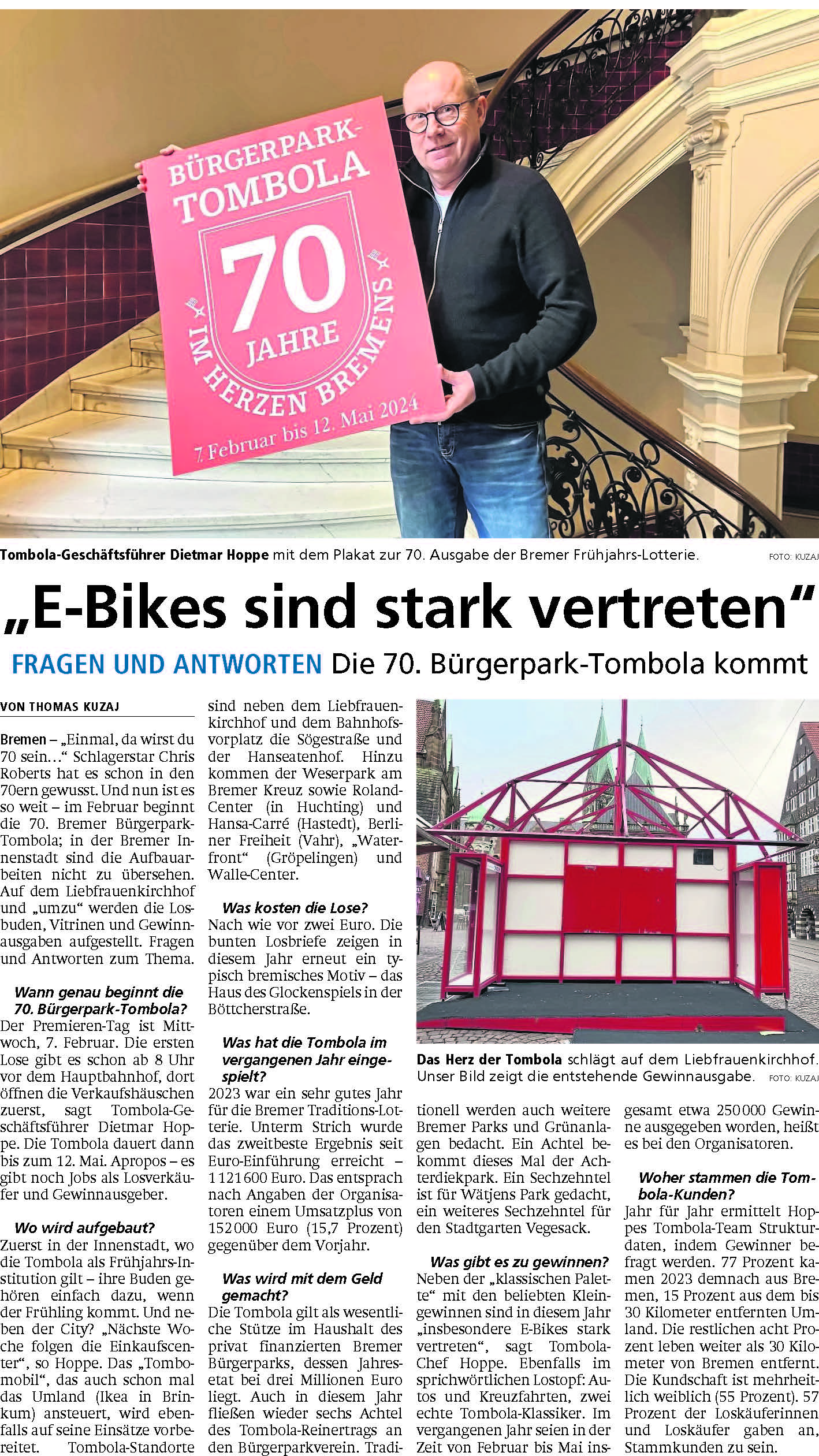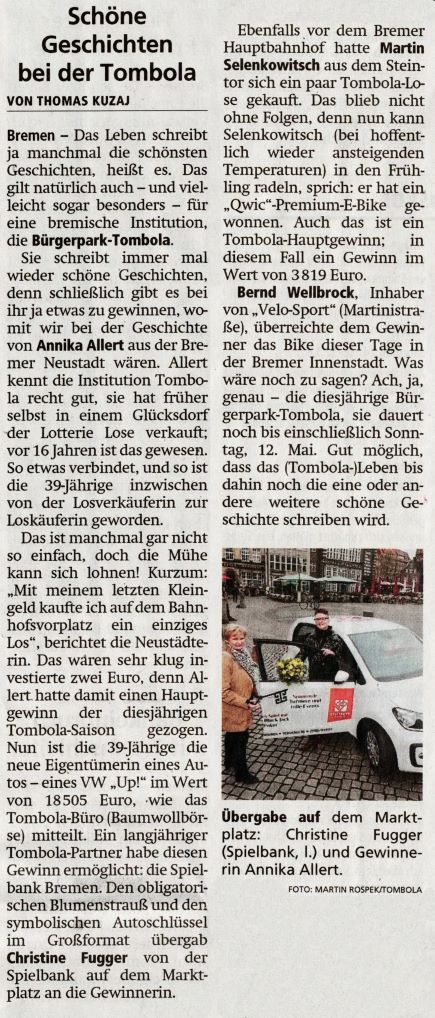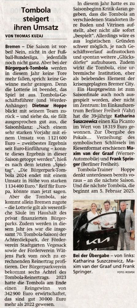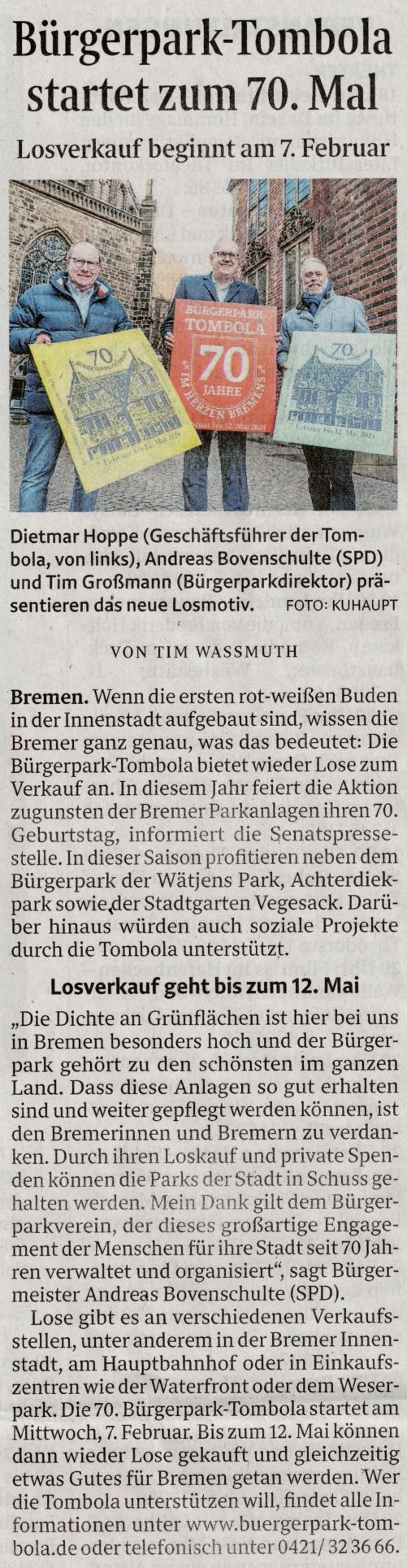 Sie möchten gerne für die Bürgerpark-Tombola zugunsten des Bremer Bürgerparks und vielen anderen Bremer Parks und Projekten hochwertige Gewinne spenden? Rufen Sie uns an, wir freuen uns darauf Ihnen die Vorteile einer Spende für diese gute Sache zu erläutern: 0421 323666.